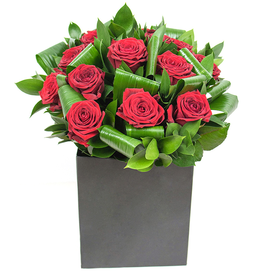 Our elegant bouquet features vibrant red roses complemented by the lushness of aspidistra leaves and ruscus. This unique arrangement brings together beautiful colors and refined design, perfect for any sophisticated setting.