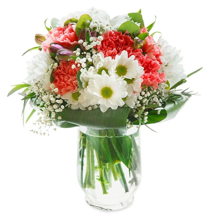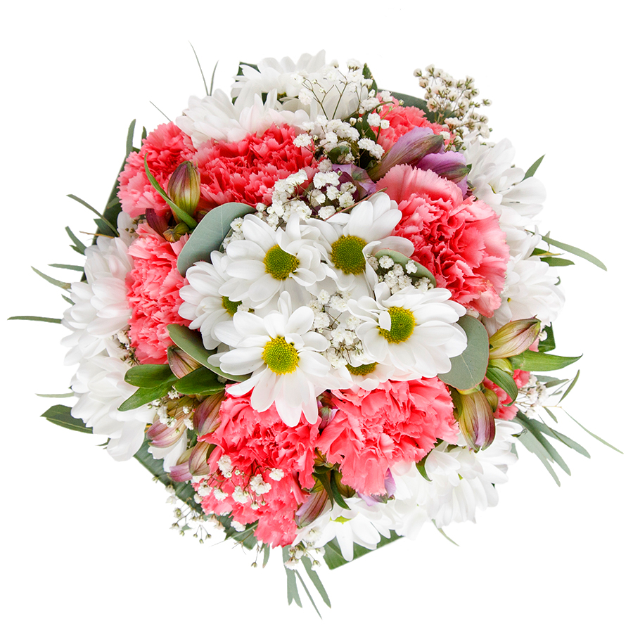 Express your affection with our delightful and unique flower arrangement. This charming bouquet features a blend of white chrysanthemums, delicate gypsophila, and soft light pink carnations, artistically arranged with aspidistra leaves.